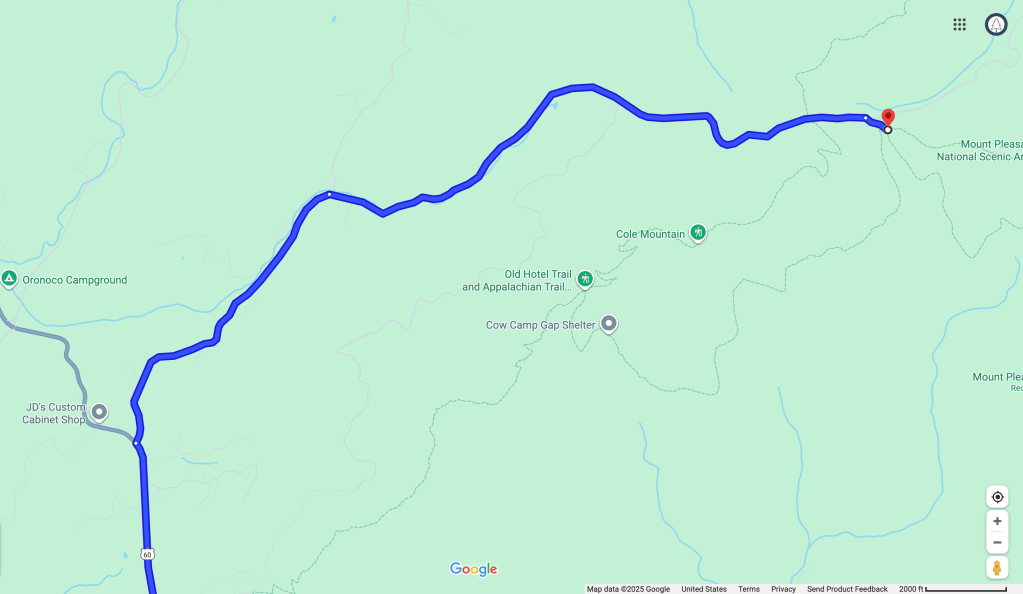 A secondary route to reach the parking lot exists, and some hiking websites consider it a “hack”. I do NOT suggest taking the route below. The road turns into a single lane access road with steep drop-offs. It winds through a secluded holler and is barely wide enough to fit one car. Again, I do NOT suggest this route: