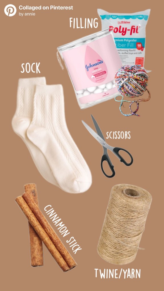 4. Place the cinnamon stick in the “open” top of the sock, for the stem.